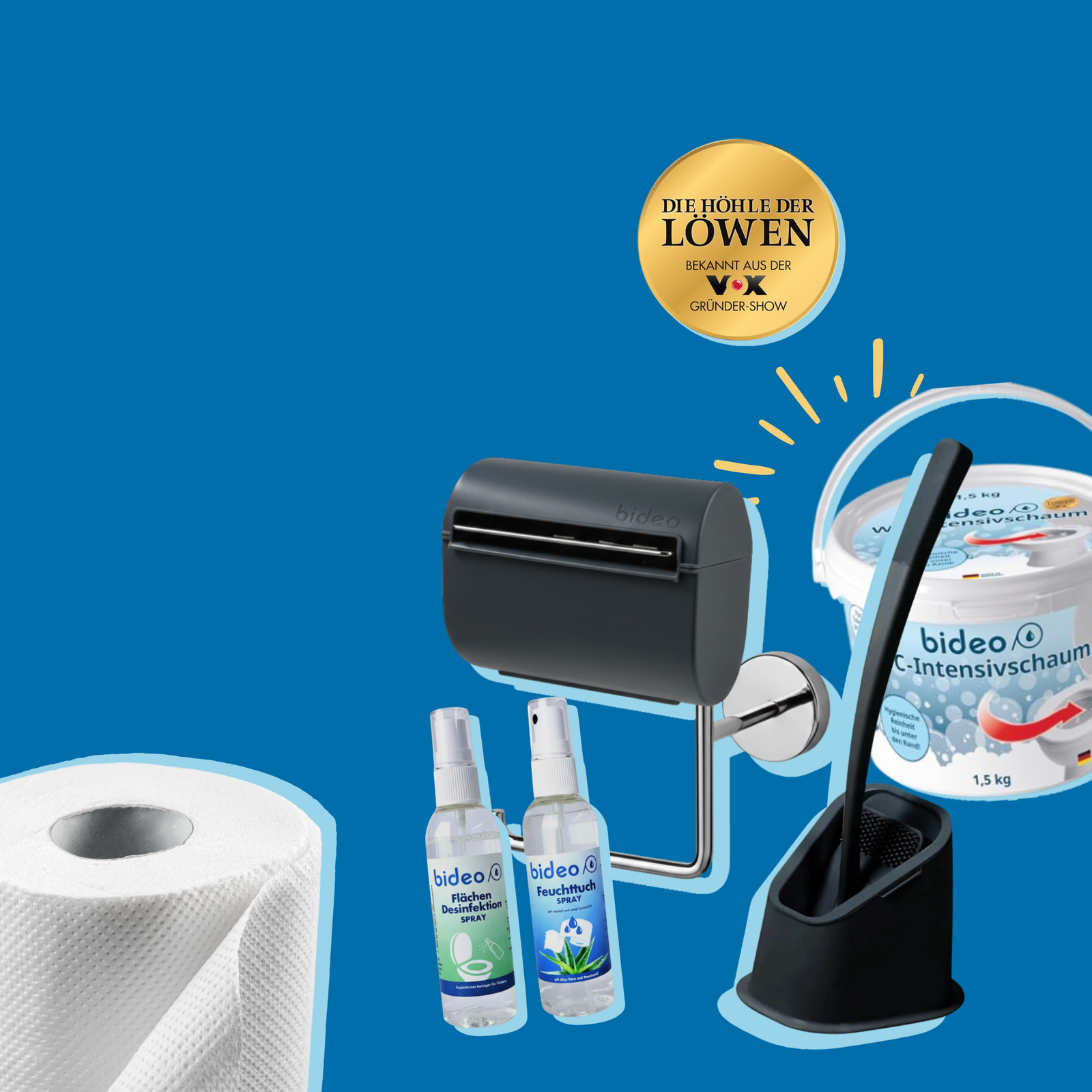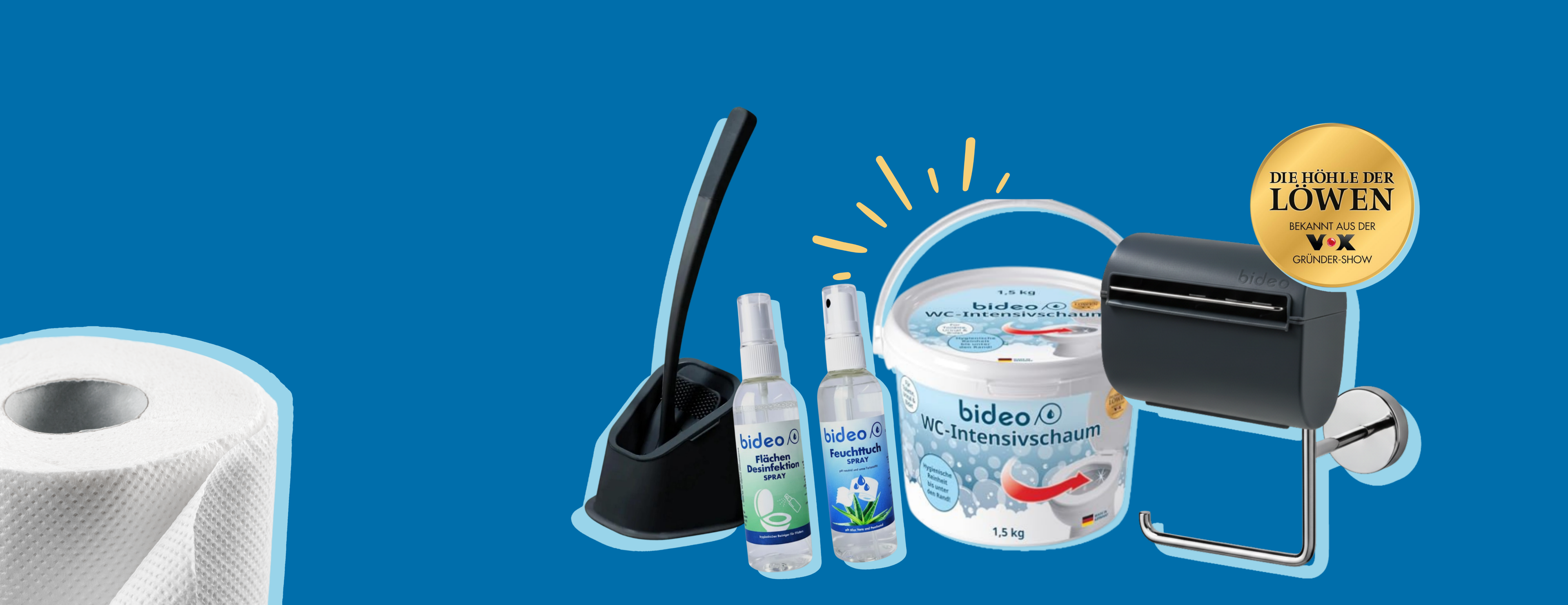 Toilettenpapierhalter, Silikon-Bürste, WC-Schaum, Feuchttuchspray & mehr – die bideo Bad-Vielfalt.